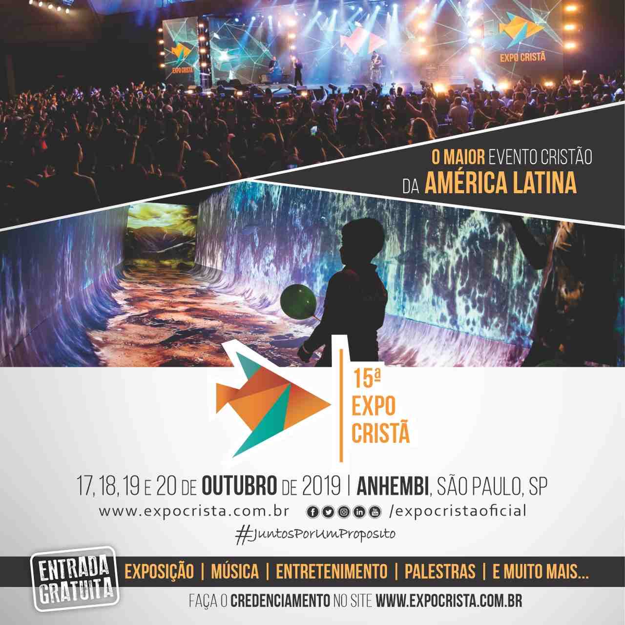 A 15ª edição da Expo Cristã, maior e mais completo evento cristão da América Latina, será realizada de 17 a 20 de outubro de 2019, no Centro de Eventos do Anhembi, em São Paulo. A entrada gratuita nos quatro dias do evento e nas programações paralelas é um atrativo que vai permitir o aumento do número de visitantes e melhorar ainda mais o poder de compra do consumidor cristão.