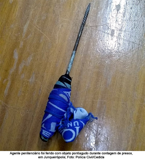 Um agente de segurança penitenciária, de 47 anos, foi ferido por um detento durante a contagem dos presos, na unidade prisional de Junqueirópolis. O fato foi registrado na Polícia Civil nesta segunda-feira (8), como tentativa de homicídio.