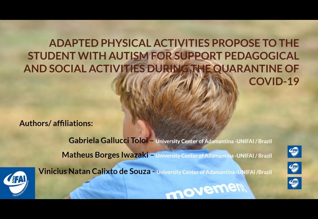 Eles apresentaram o artigo “Proposta de atividades motoras adaptadas ao aluno com autismo visando apoio às atividades pedagógicas e sociais durante a quarentena da Covid-19”, que integrou o Trabalho de Conclusão de Curso (TCC) dos dois estudantes no curso de Licenciatura em Educação Física.