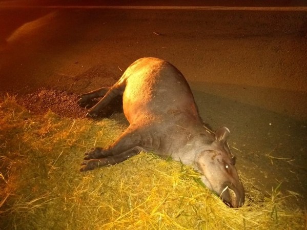 Após a colisão observou que se tratava de uma anta. O animal era uma fêmea adulta com aproximadamente 150 quilos, que foi a óbito de imediato.