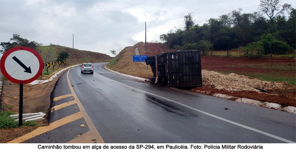 Por volta das 12h25 desta quarta-feira (25), um caminhão carregado com pó de serra tombou fora da pista em uma alça de acesso localizada no km 680,100 da Rodovia Comandante João Ribeiro de Barros (SP-294), em Paulicéia (SP).