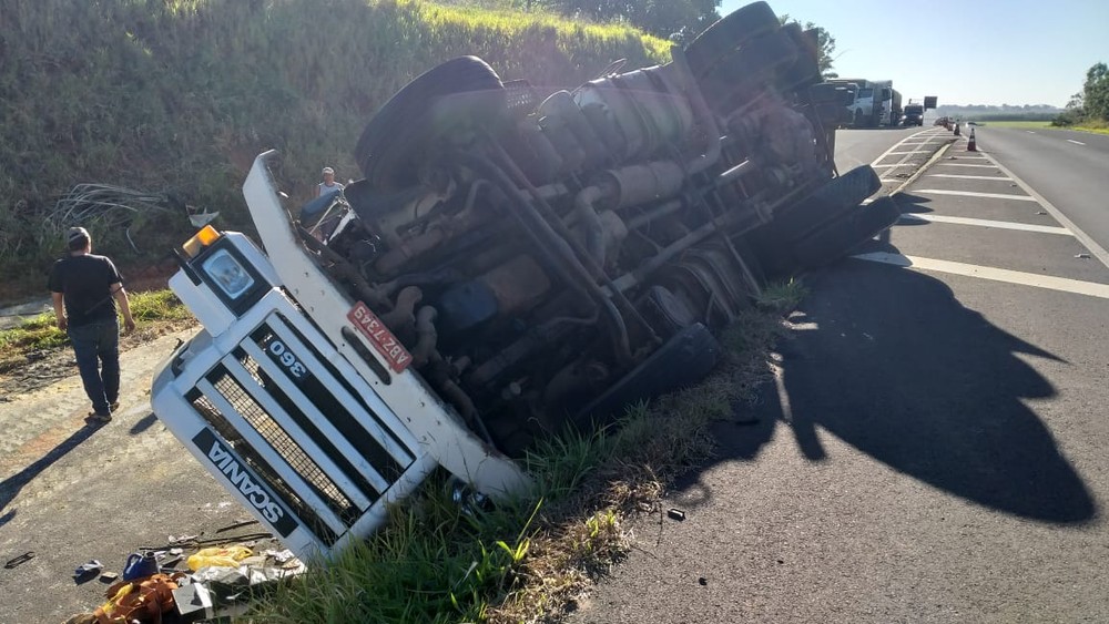 O caminhão estava carregado de gesso agrícola e parte da carga ficou espalhada pela via. Não houve vítimas.