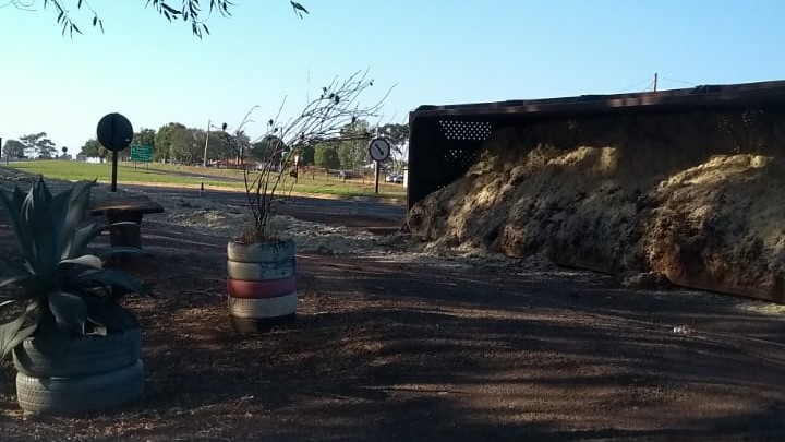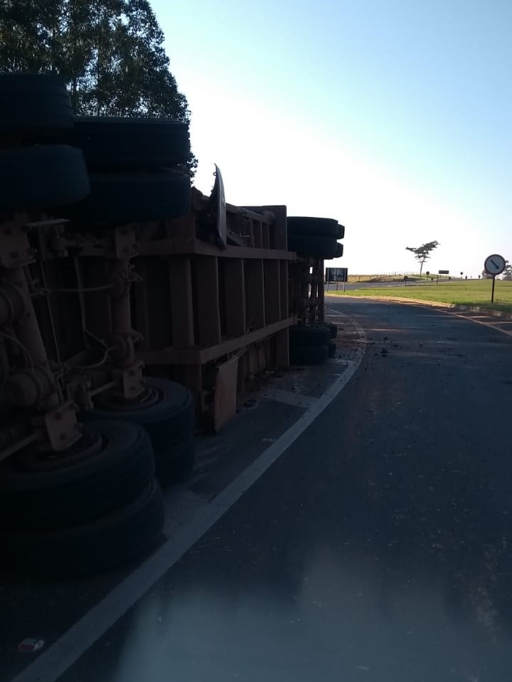 Carreta de bitrem tomba na SP-294, rotatória da Lagoa Seca