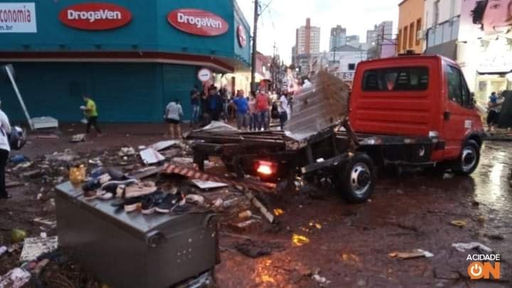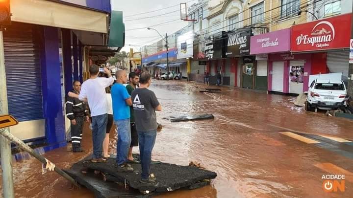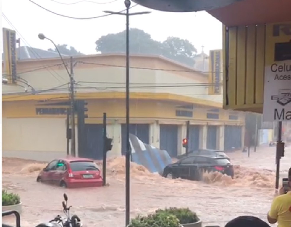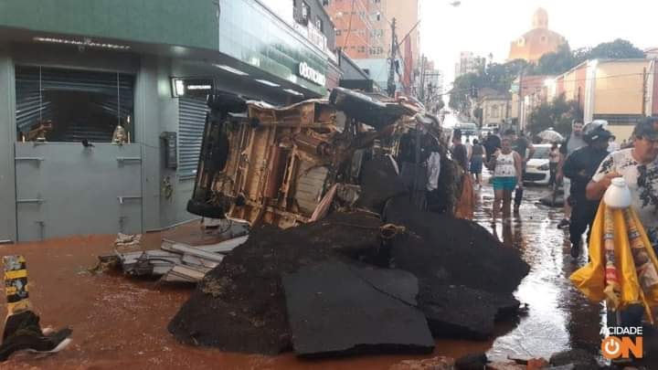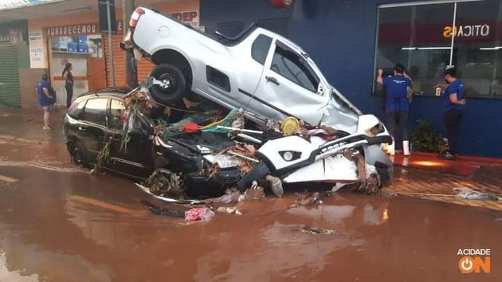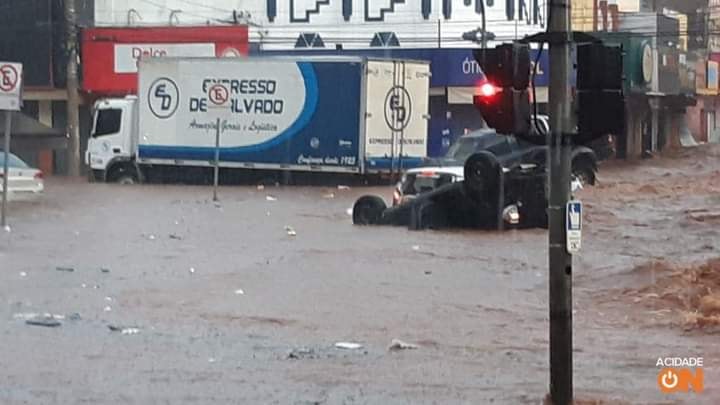 Há registro de vários carros que foram levados pela enxurrada na praça Itália e também no Centro da cidade.