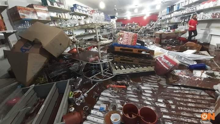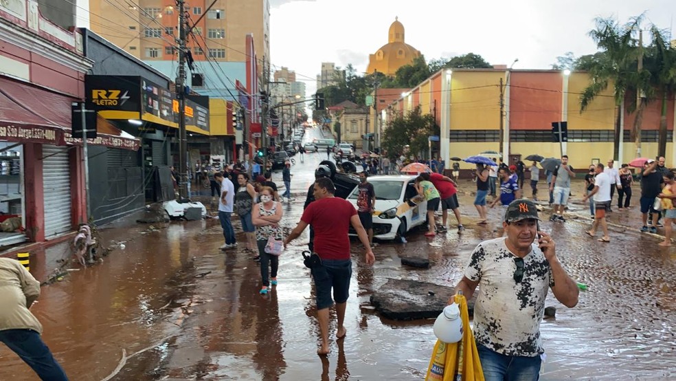 As placas de calçamento do calçadão tiveram vários pedaços arrancados pela água, que também invadiu lojas. Cerca de 100 estabelecimentos comerciais foram danificados às vésperas da Black Friday.