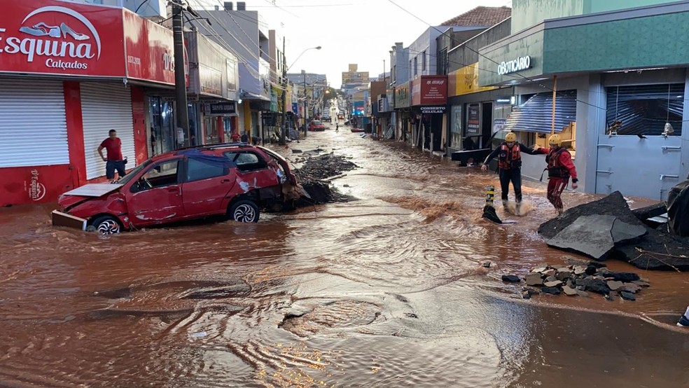 Segundo a Secretaria de Segurança Pública, 26 carros foram levados pela correnteza. Um deles invadiu uma loja.