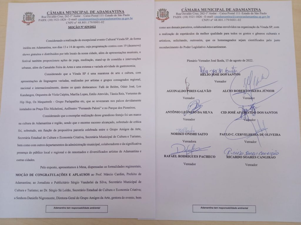 De autoria do vereador Hélio José dos Santos e subscrita por todos os demais vereadores, a Câmara Municipal de Adamantina concedeu à Secretaria de Cultura de Adamantina Moção de Congratulações e Aplausos pela realização da Virada Cultural SP.