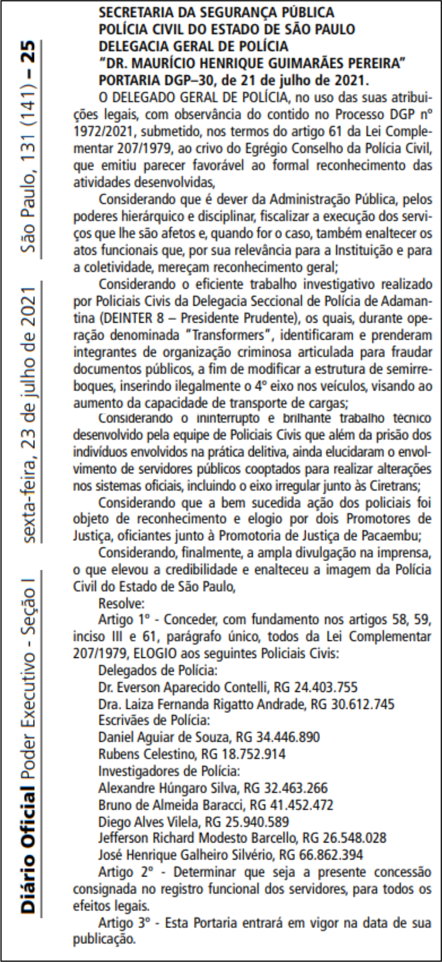 Por meio da Portaria DGP–30, de 21 de julho de 2021 (íntegra abaixo), publicada na edição desta sexta-feira (23) do Diário Oficial do Estado de São Paulo, o delegado geral da Polícia Civil do Estado de São Paulo, Ruy Ferraz Fontes, concedeu elogio oficial policiais civis de Adamantina e região pela atuação na Operação Quarto Eixo (ou Operação Transformers), cujo trabalho investigativo foi realizado por policiais civis da Delegacia Seccional de Polícia de Adamantina (DEINTER 8 – Presidente Prudente).