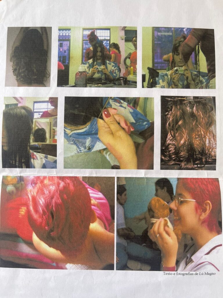 Há tempos eu sonhava em fazer isso! E fiz. Agora, a imagem que eu via no espelho nada parecia com a menina tímida e desconfiada que, tomada de um instante de coragem, há pouco entrara ali. Ainda procurei por um bom tempo naquelas enormes paredes espelhadas o meu ar meio comportado, sempre querendo ser hippie. E, como sabia, desde o momento em que coloquei o primeiro pé no salão, não encontrei. Também teria sido cortado?