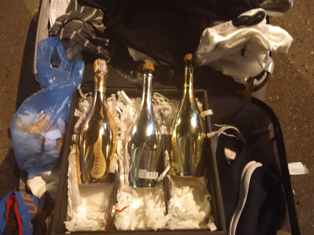 Em seguida, foi vistoriado o bagageiro externo, momento em que os policiais localizaram mais uma bolsa pertencente a outro passageiro, onde havia três garrafas de champanhe. O líquido foi verificado e submetido a um teste, que deu positivo para cocaína.