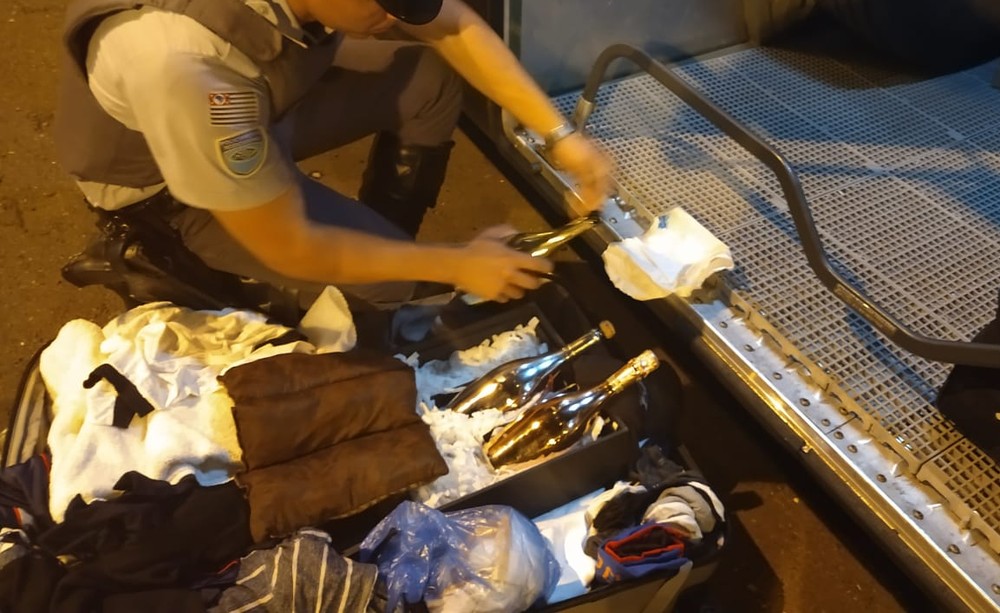 Em seguida, foi vistoriado o bagageiro externo, momento em que os policiais localizaram mais uma bolsa pertencente a outro passageiro, onde havia três garrafas de champanhe. O líquido foi verificado e submetido a um teste, que deu positivo para cocaína.
