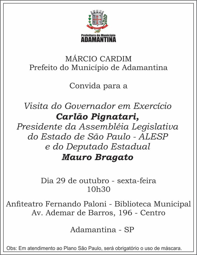 O governador do Estado de São Paulo, deputado Carlão Pignatari, estará nesta sexta-feira (29), em Adamantina, onde cumpre agenda na cidade. A recepção será no anfiteatro da Biblioteca Pública Municipal às 10h30. O convite oficial divulgado pela Prefeitura de Adamantina cita também a presença do deputado estadual Mauro Bragato.