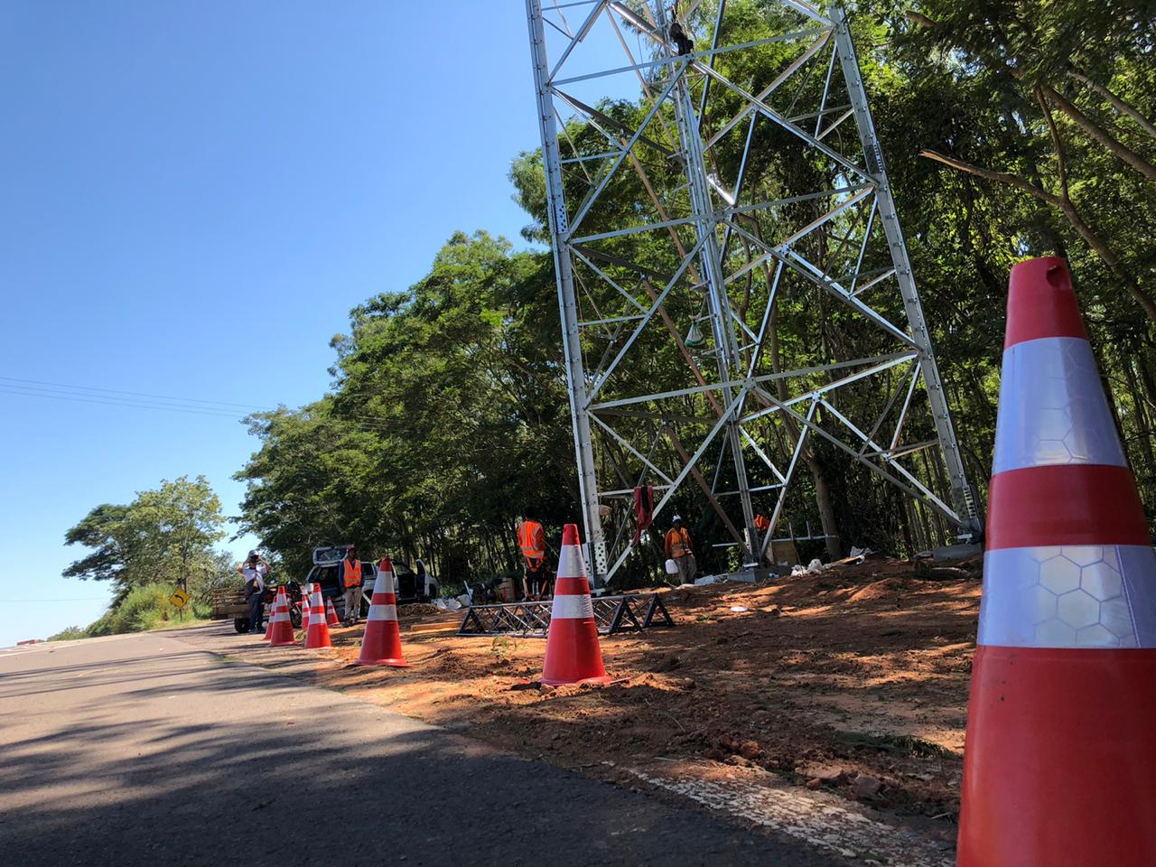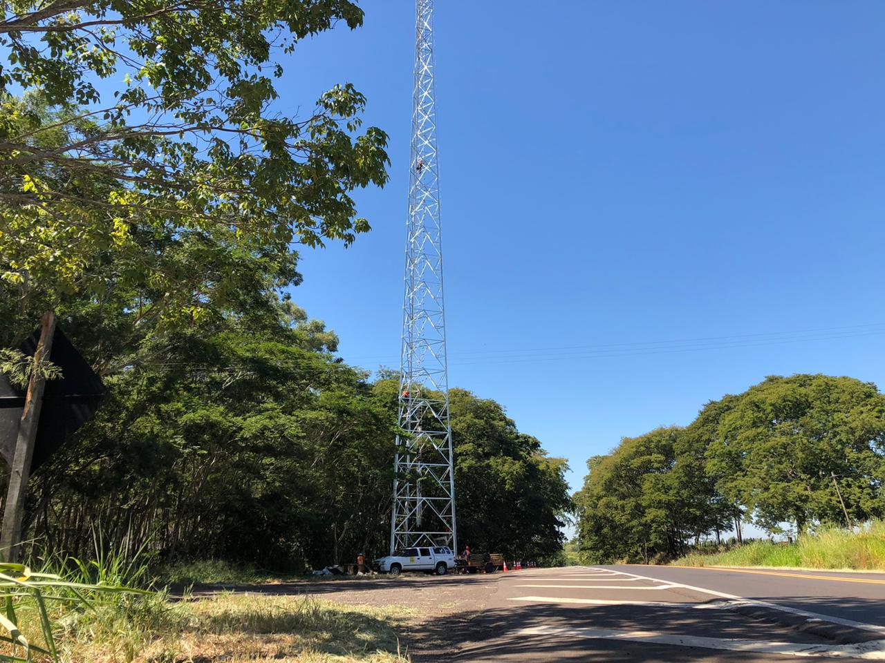 Torre sendo erguida no acesso ao bairro Tucuruvi, em Adamantina. (Foto: Life FM)