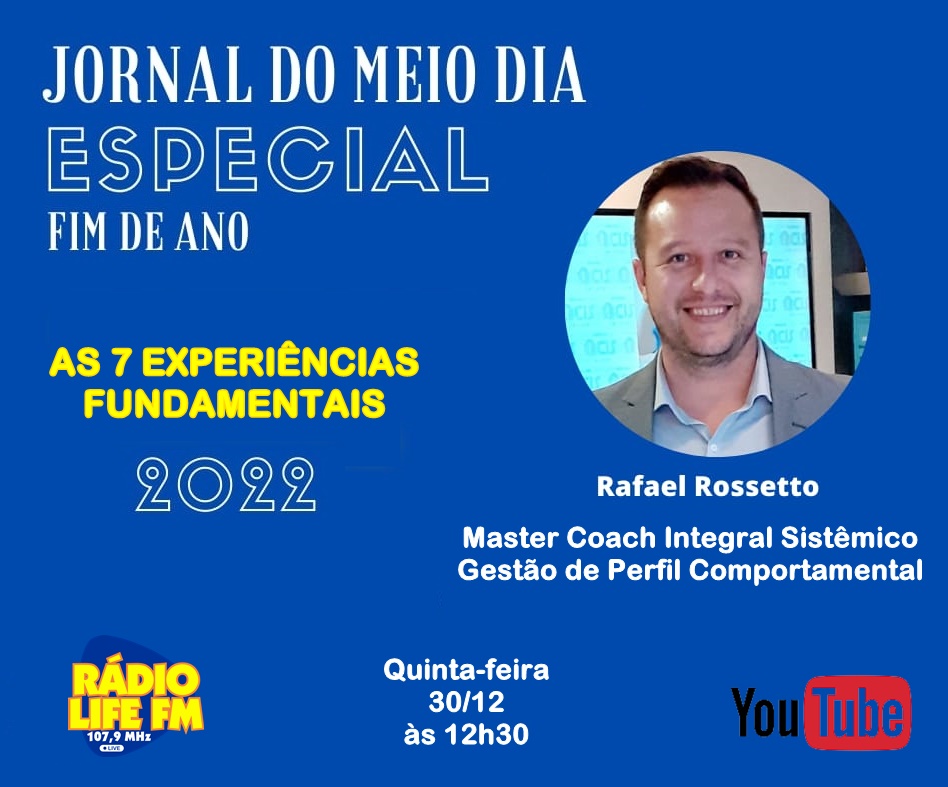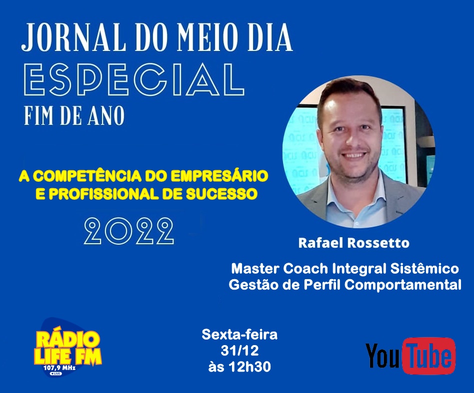 O nosso convidado do jornal nesses três últimos dias do ano será o Master Coach Integral Sistêmico, Rafael Rossetto, que acumula em sua carreira cursos e grandes experiências, confira: