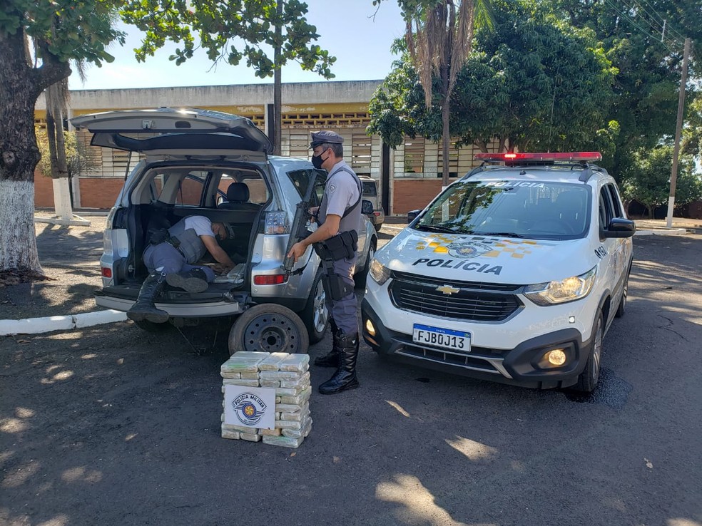 No total, os policiais encontraram 55 tabletes do entorpecente escondidos em um fundo falso no porta-malas do veículo, que pesaram 57,630 quilos.