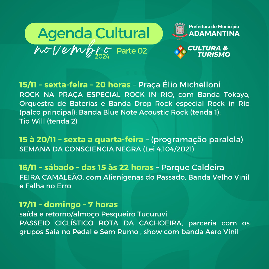 Nesta semana, a agenda cultural de novembro ainda traz a realização do Rock na Praça Especial Rock in Rio na sexta-feira (15), com as bandas Tokaya, Orquestra de Baterias e Drop Rock (palco principal) e, ainda, a Banda Blue Note Acoustic Rock (tenda 1) e Tio Will (tenda 2).