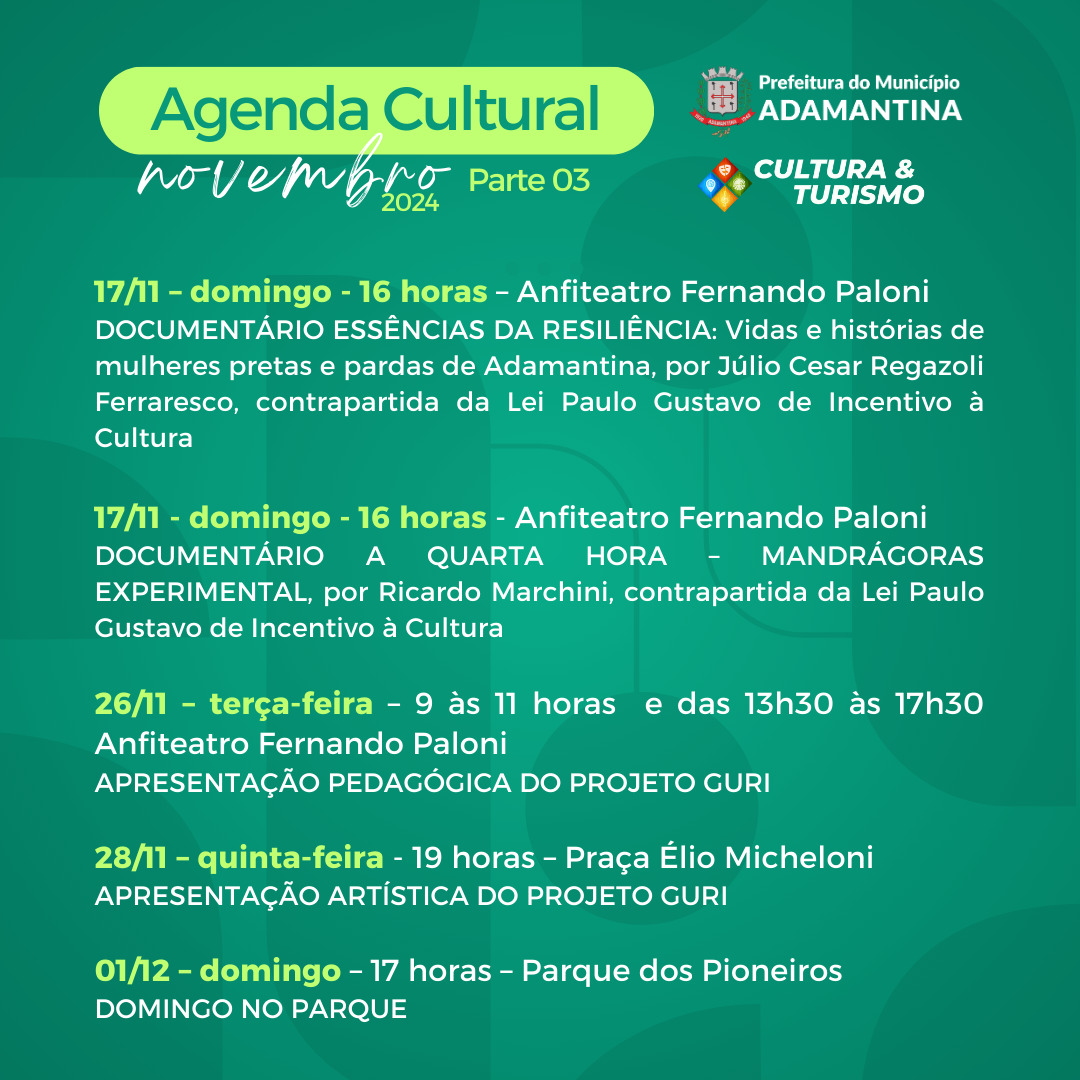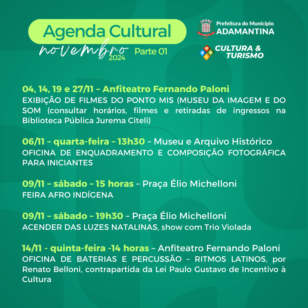 A programação integra a Agenda Cultural promovida pela Prefeitura de Adamantina, por meio da Secretaria de Cultura e Turismo.