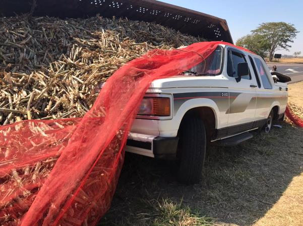 Parte de bitrem carregado de cana tomba sobre caminhonete na SP-294