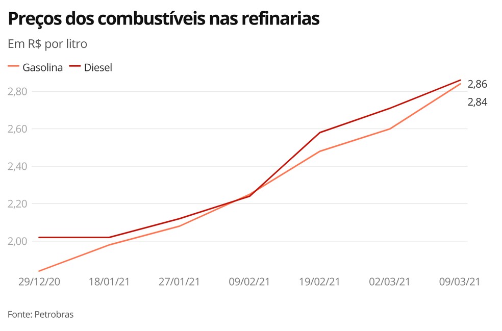 A Petrobras vai elevar mais uma vez os preços da gasolina e do diesel nas refinarias a partir de terça-feira (9), informou a companhia nesta segunda-feira, por meio da assessoria de imprensa. A nova alta vem em meio aos trâmites para a substituição do presidente da petroleira, após intervenção do presidente Jair Bolsonaro.