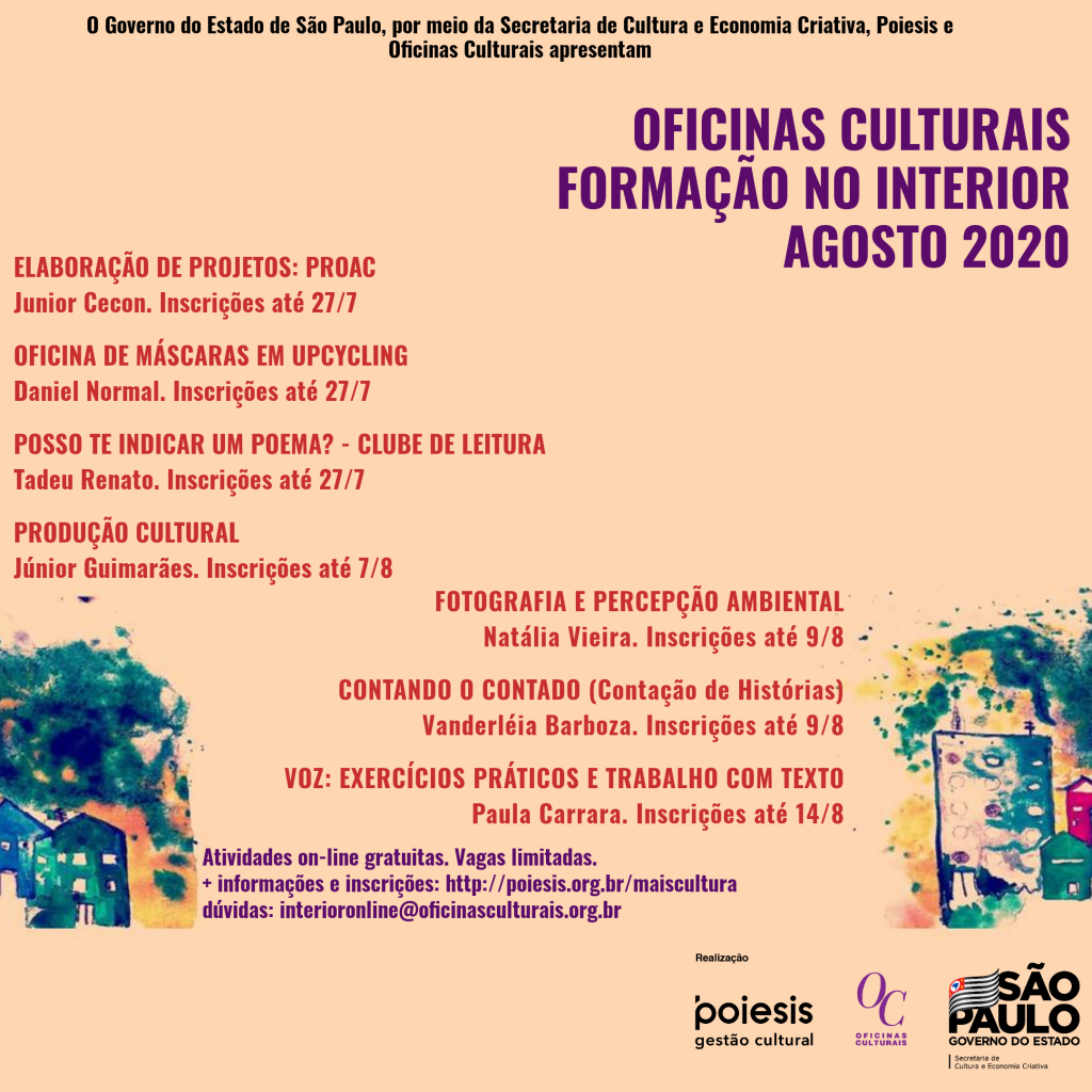 Os interessados têm até a próxima segunda-feira (27) para garantir sua participação nas oficinas “Posso te indicar um poema? Clube de Leitura” e Oficina de Máscaras em Upcycling. As oficinas online são realizadas pelo aplicativo Google Meet.