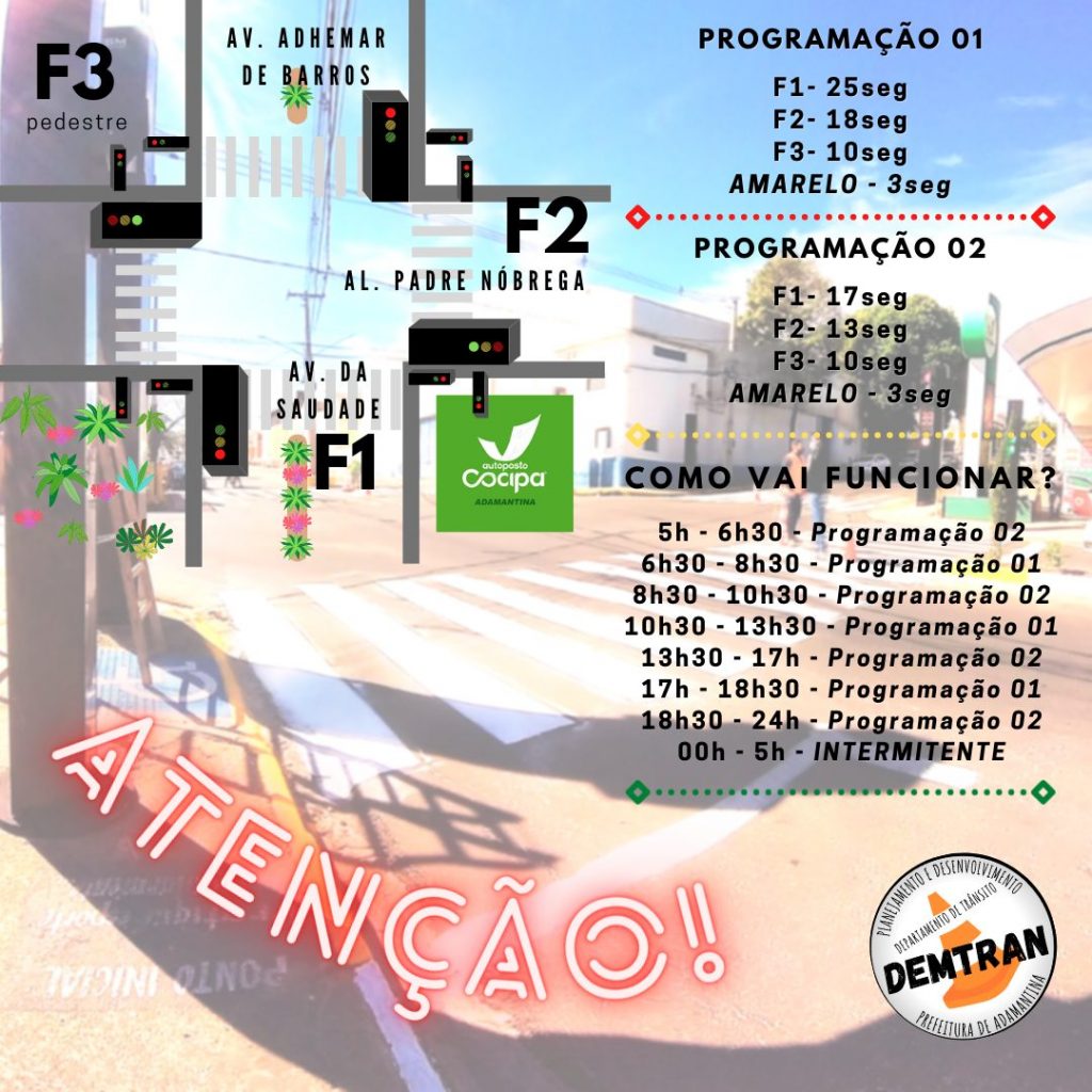 Com o funcionamento do semáforo no Parque dos Pioneiros, a Prefeitura de Adamantina, por meio do Departamento Municipal de Trânsito (DEMTRAN), deu início a estudos de tráfego para o funcionamento dos semáforos existentes na cidade.