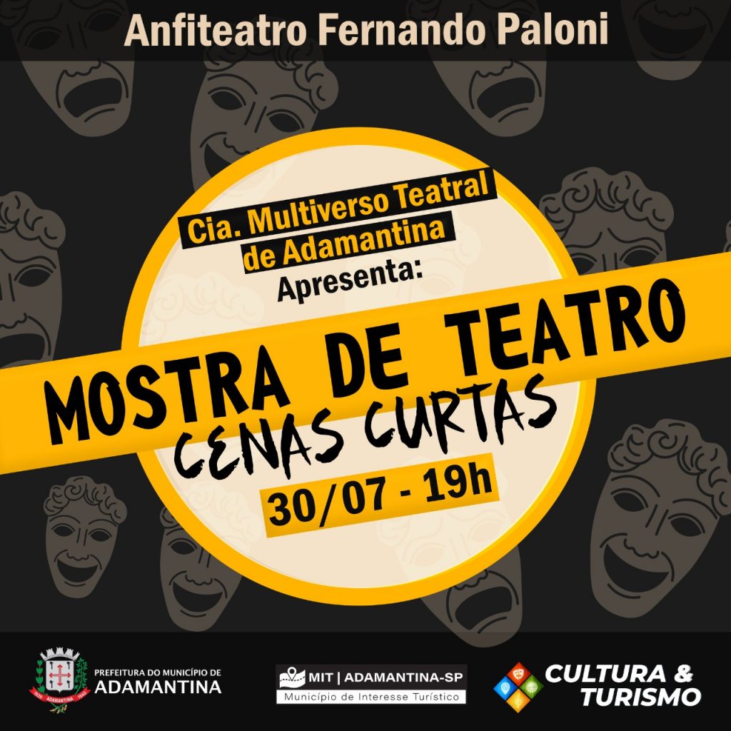 Ainda no sábado (30), mas a partir das 19h, o Anfiteatro Fernando Paloni recebe a apresentação da Cia Multiverso Teatral de Adamantina “Mostra de Teatro Cenas Curtas”. A entrada é gratuita.