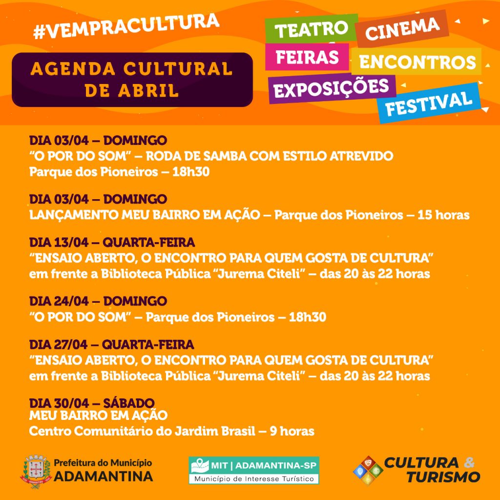 A Prefeitura de Adamantina, por meio da Secretaria de Cultura e Turismo, preparou uma programação especial para o mês de abril com o objetivo de levar cultura e entretenimento à população de forma gratuita. Confira abaixo as datas das atividades.