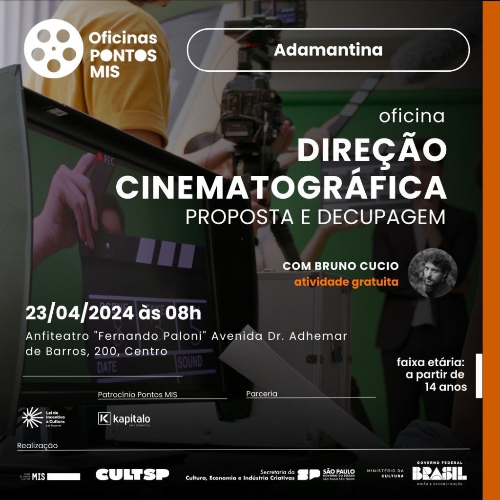 Adamantina recebe mais uma oficina por ser Ponto Mis. Desta vez, a temática abordada será “Direção Cinematográfica – Proposta e Decupagem”. Os encontros serão realizados na segunda-feira às 14h e também na terça-feira às 8h, ambas no Anfiteatro Fernando Paloni.