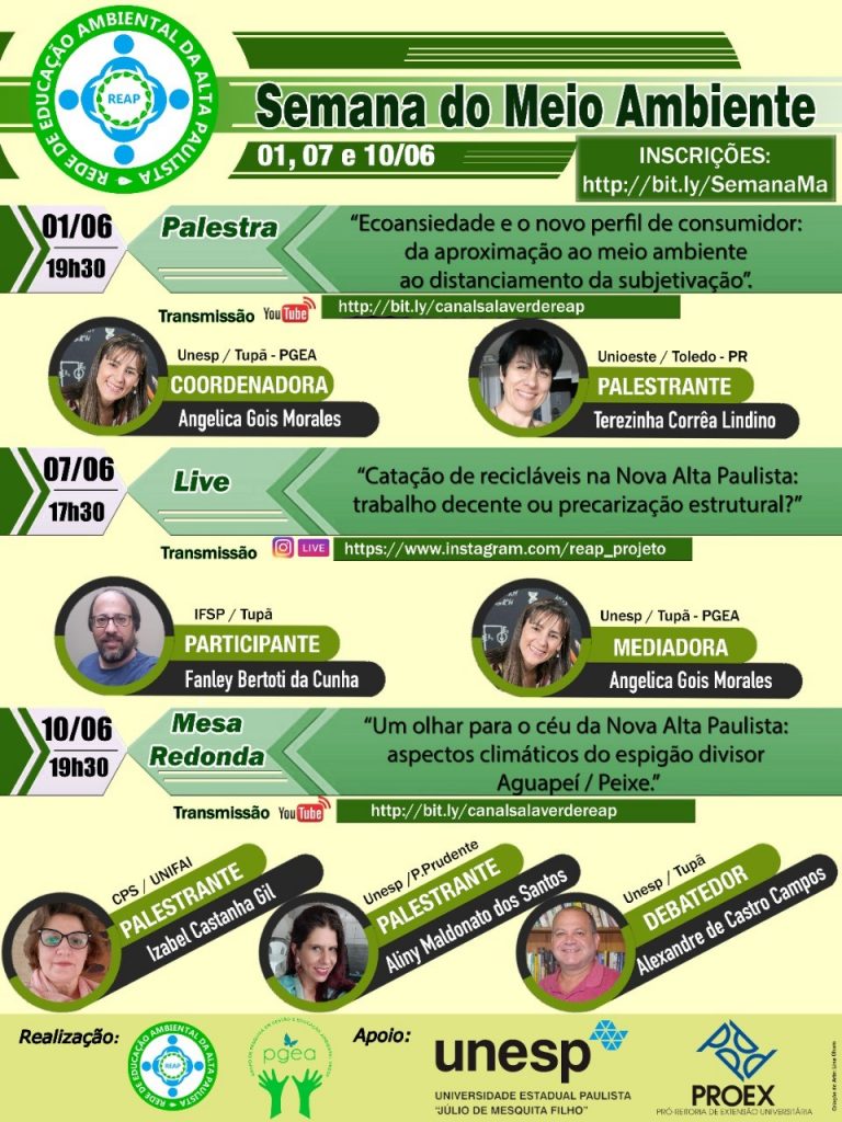 Dia 1 de junho o tema será sobre “Ecoansiedade e o novo perfil de consumidor”, dia 7 será abordado sobre “Catação de recicláveis na Nova Alta Paulista: trabalho decente ou precarização estrutural”, e dia 10 o título é “Um olhar para o céu da Nova Alta Paulista: aspectos climáticos do espigão divisor Aguapeí/Peixe”.