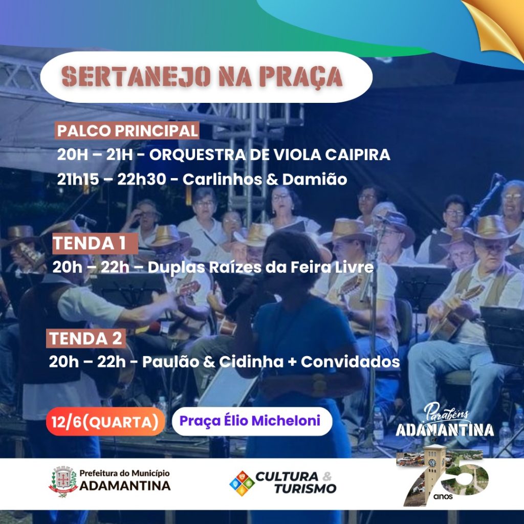 Nesta quarta-feira (12), na Praça Élio Micheloni acontece o Sertanejo na Praça a partir das 19h com a Orquestra de Viola Caipira, Carlinhos & Damião; Duplas Raízes e Paulão & Cidinha e Convidados.