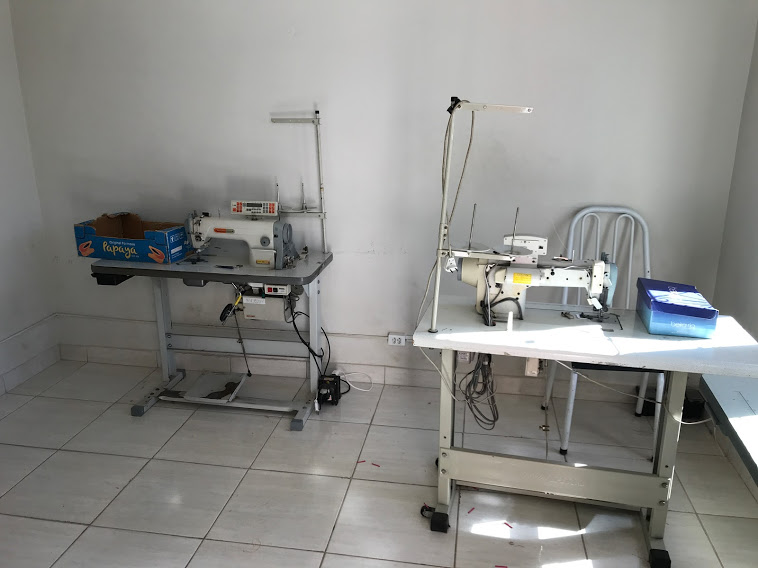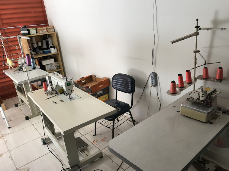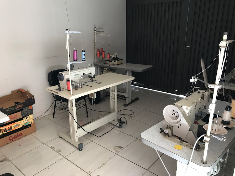 Trata-se de um imóvel residencial que também abriga o espaço de trabalho do grupo, cuja oficina de costura ocupa dois cômodos da casa: uma garagem que recebeu fechamento e uma das salas, onde estão os equipamentos de costura. “As máquinas são nossas e foram trazidas por nós, quando chegamos a Adamantina. Fomos juntando e comprando”, explica Noé.
