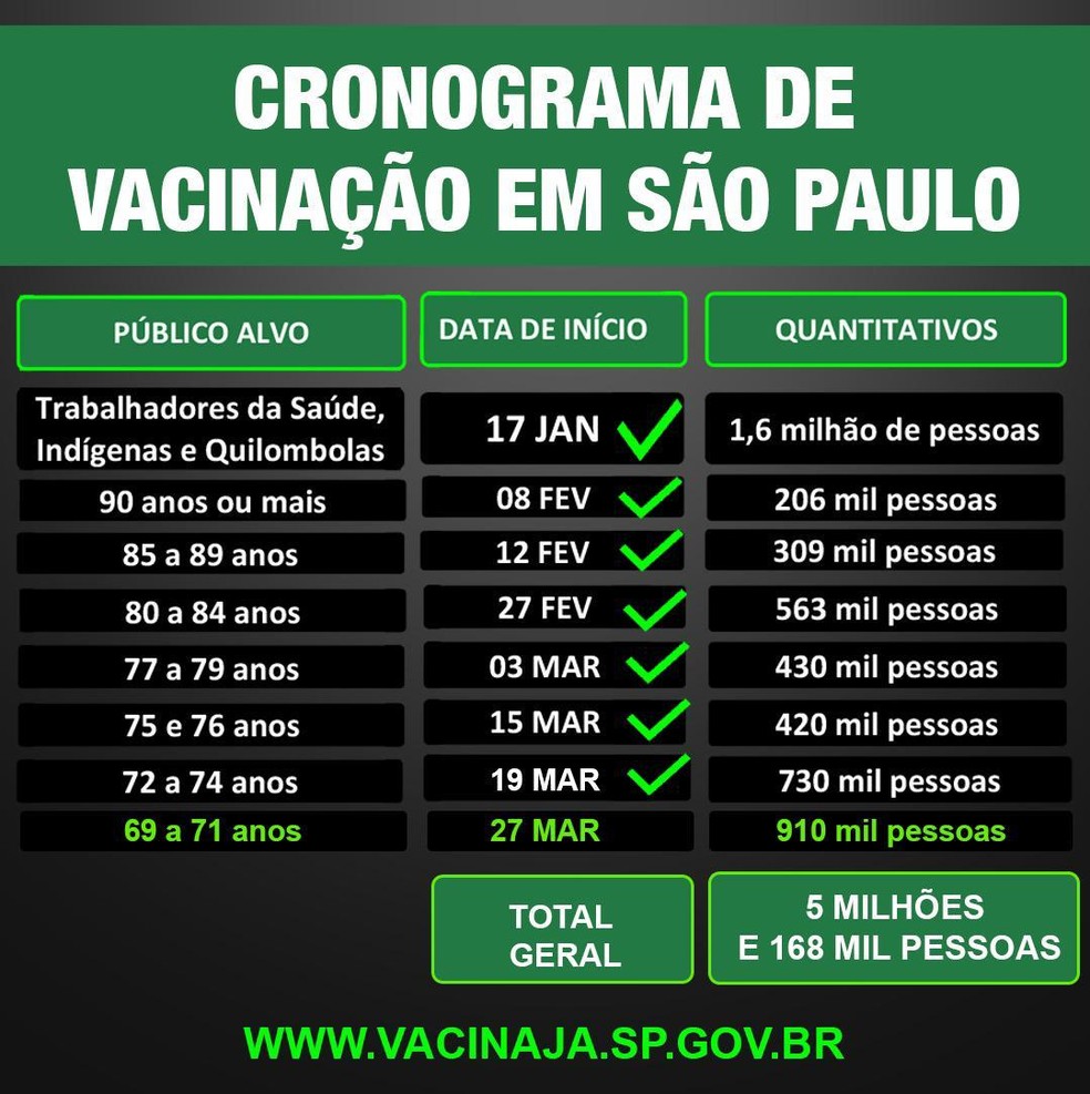 A previsão inicial era a de começar a vacinar o público de 70 e 71 anos no dia 29. Entretanto, na semana passada, o governo disse que conseguiu antecipar para o dia 27 e incluir a população de 69 anos.
