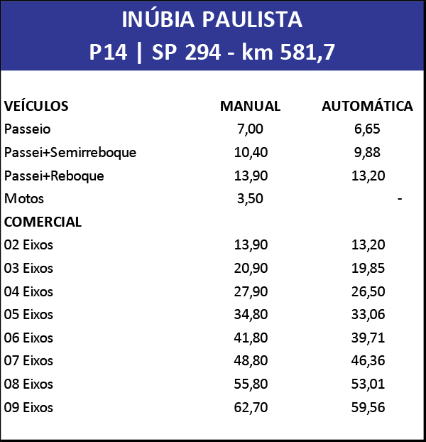 A partir da 0h deste domingo (4), os valores das tarifas de pedágio em todas as praças da Eixo SP Concessionária de Rodovias serão atualizados. O reajuste anual, previsto em contrato de concessão, será de 4,18%, com base na inflação, medida pelo IPCA (Índice de Preços ao Consumidor Amplo) do período.