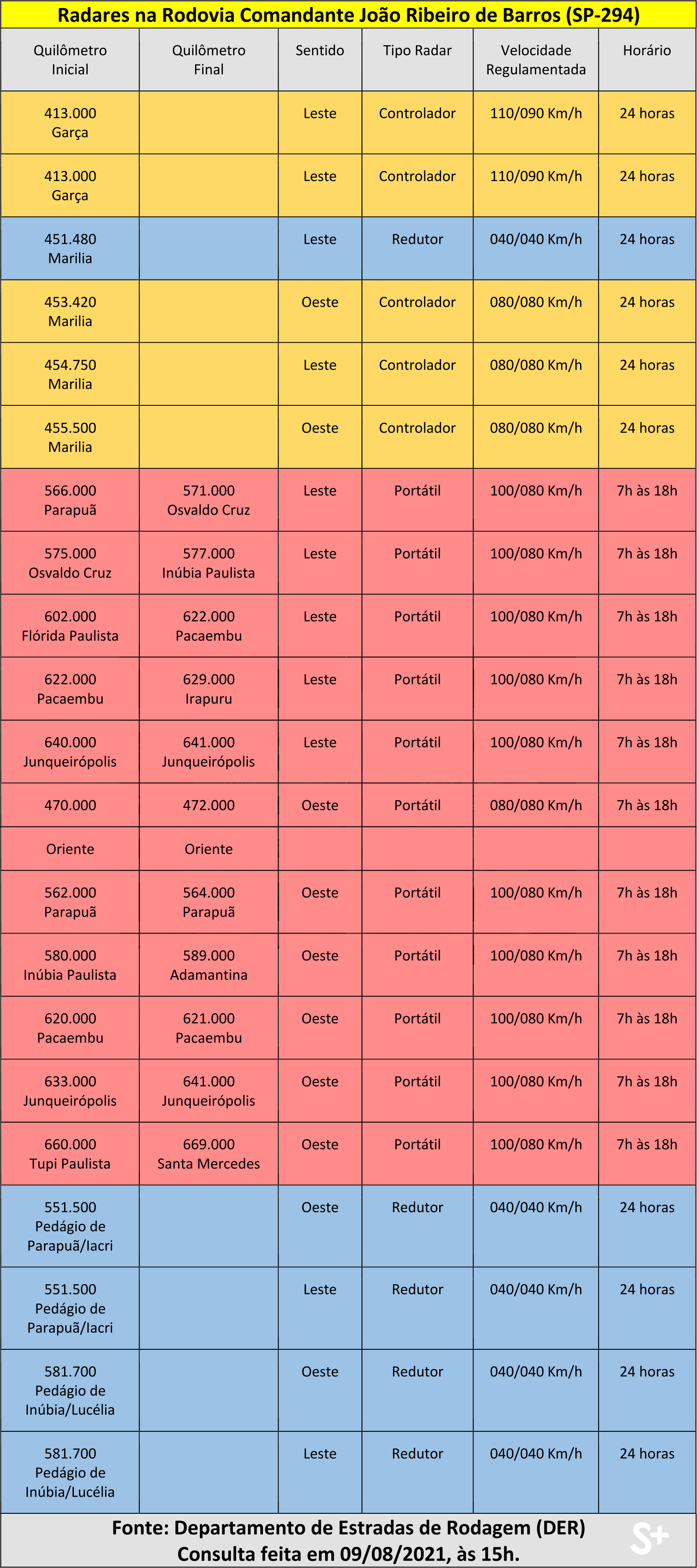 A Rodovia Comandante João Ribeiro de Barros (SP-294), no trecho entre Garça e Santa Mercedes, tem 21 pontos com fiscalização eletrônica de velocidade, por radares (veja quadro abaixo). As informações públicas sobre a localização dos dispositivos estão no site do Departamento de Estradas de Rodagem (DER), consultado nesta segunda-feira (9) pelo SIGA MAIS.